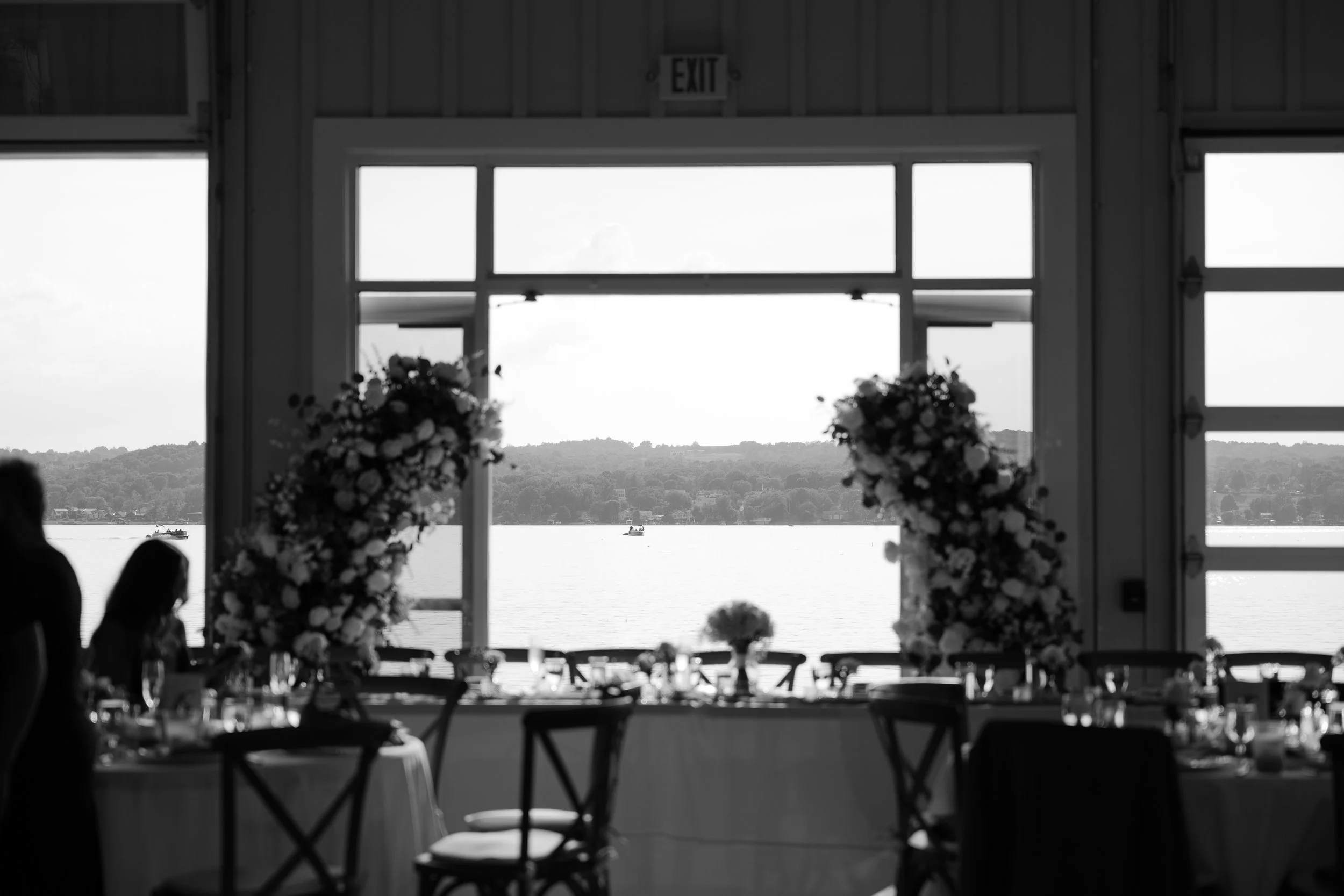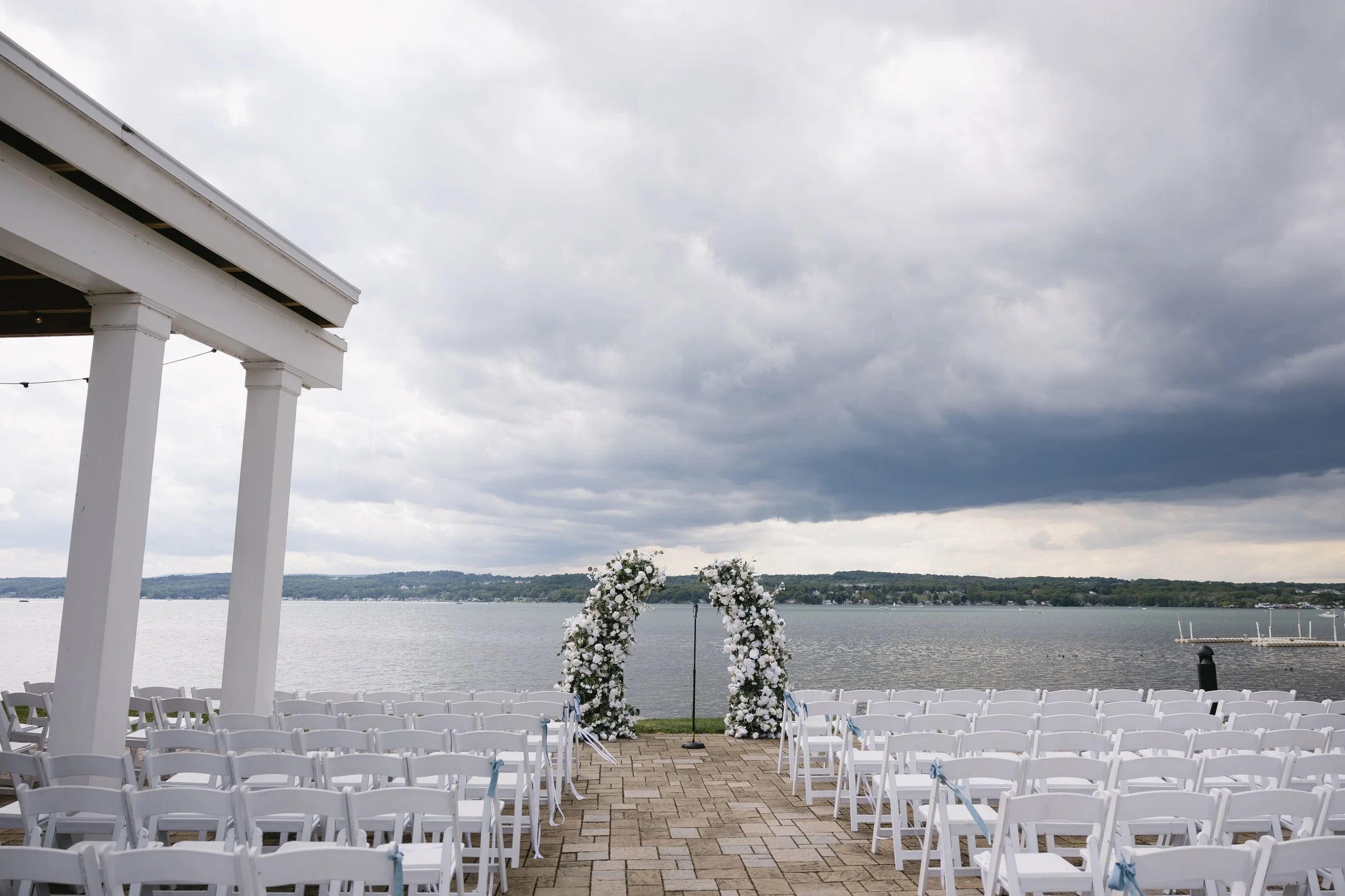 Their ceremony and reception both took place at The Fallbrook House, which sits right on Lake Canandaigua and offers incredible views along with full-service support. The ceremony backdrop overlooking the water was framed with rented floral arches from It’s My Party, adding just enough structure while keeping the focus on the lake. After the ceremony, we worked with the photographers to gather extended family members efficiently so portraits could be completed before Jake and Ashley joined cocktail hour.