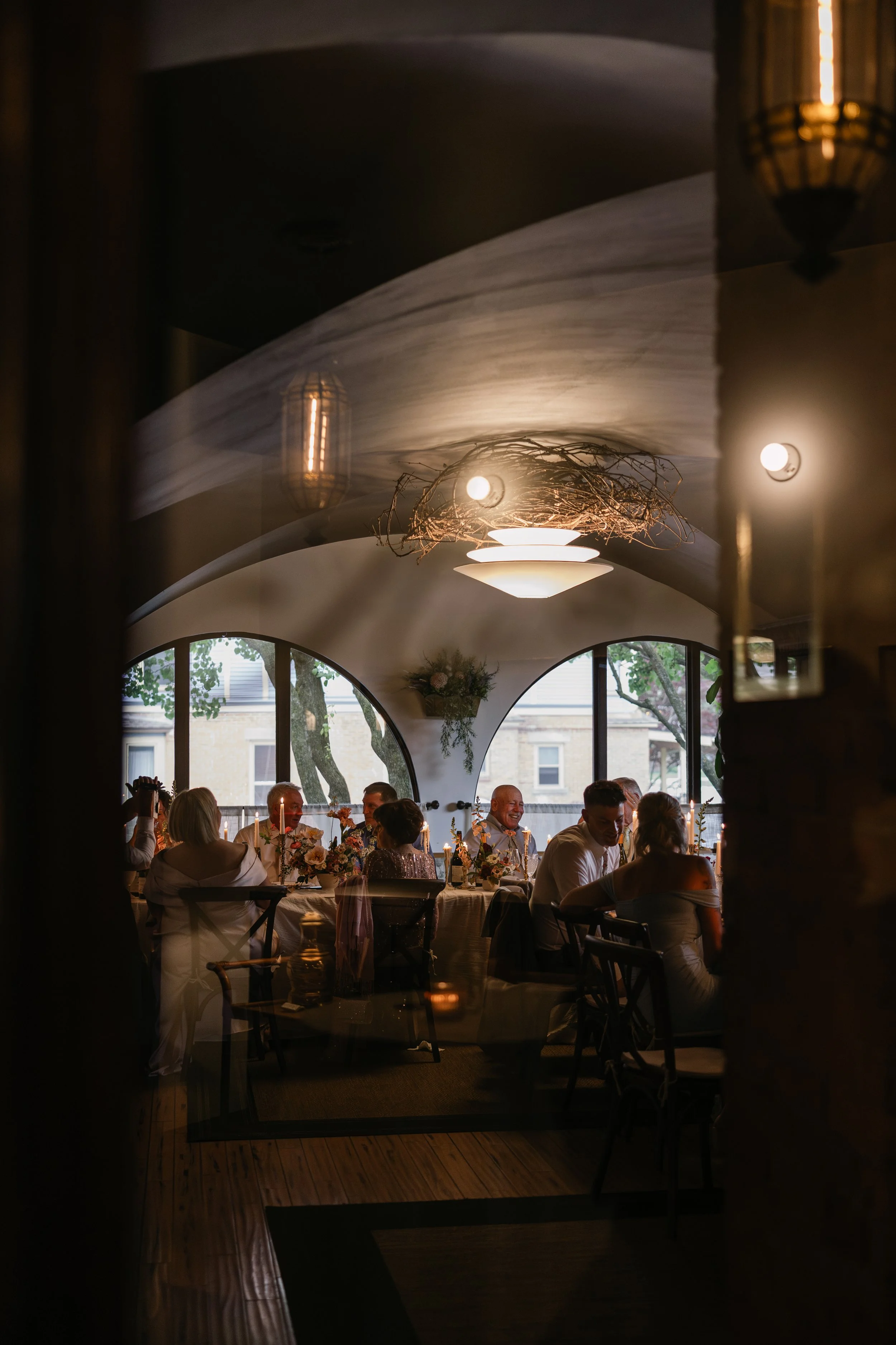 Dinner was intentionally intimate—a candlelit meal with just their closest people. The room glowed with vintage pieces, rich textures, and cozy, elegant details. However, timing was key, with a second wave of guests arriving later in the evening. Ember worked closely with The Alexander staff to keep dinner on schedule and flowing smoothly. As dinner wrapped, guests were invited to the bar area while we flipped the space into a dance floor—bringing out late-night bites and desserts, resetting tables, and transforming the energy of the room.
